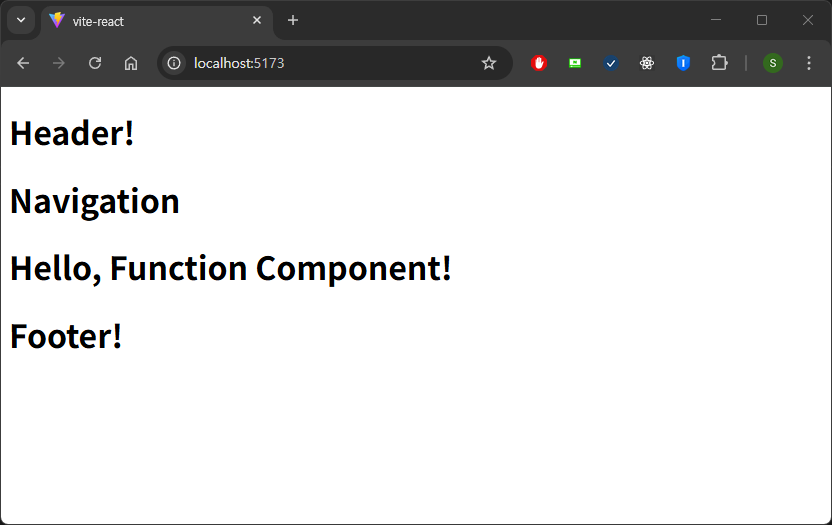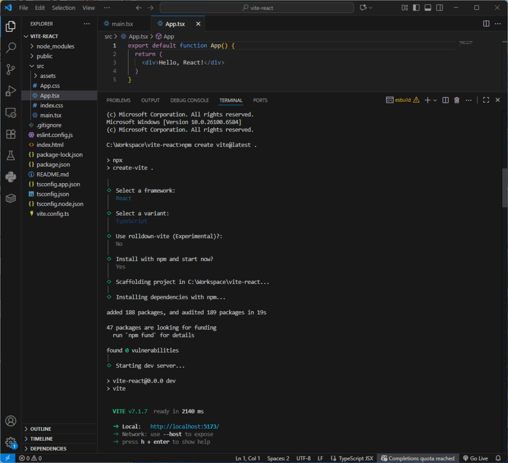 불필요한 파일들을 정리한 후 npm run dev 명령어를 실행하여 “Hello, React!”가 화면에 정상적으로 출력해 보았습니다.
