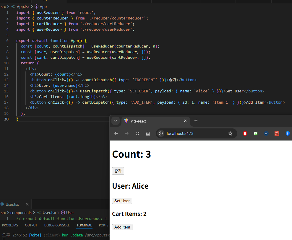 상태 로직이 복잡해질 경우에는 useReducer 훅의 활용이 효과적이라는 것을 학습했습니다. count, user, cart와 같이 복잡한 상태들을 useReducer로 관리하는 예제를 실습하며, 관련 함수들을 별도의 reducer 디렉토리에 분리하여 작성함으로써 코드의 가독성과 유지보수성을 높일수 있음을 알게되었습니다. 이를 통해 “간단한 상태는 useState, 복잡한 상태는 useReducer”를 사용하면 효율적이라는 것을 이해하게 되었습니다.