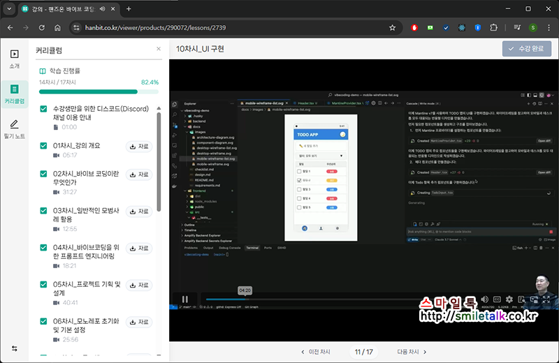 저처럼 유료 인강을 병행해서 들으면 책에서 배운 내용을 실제로 적용하고 눈으로 확인하면서 더 깊이 이해할 수 있었어요. 특히 아직 부족하다고 느끼는 부분은 저자분의 유료 인강의 도움을 받으면 실제로 나만의 프로젝트에 바이브 코딩을 적용할 수 있는 실력을 빠르게 향상시킬 수 있을 것 같습니다. 책으로 개념을 다지고, 인강으로 실습과 노하우를 배우니 학습 효과가 극대화되는 것 같네요!